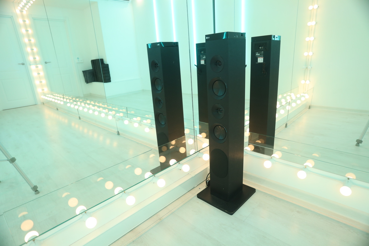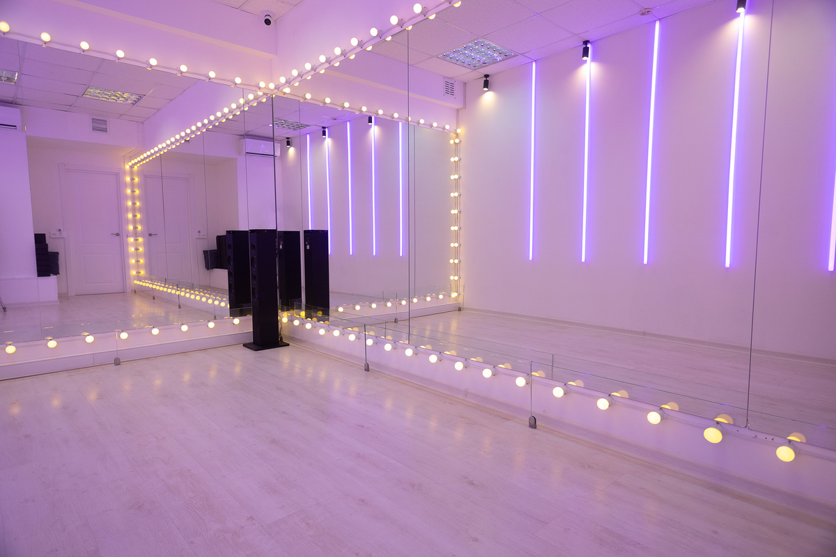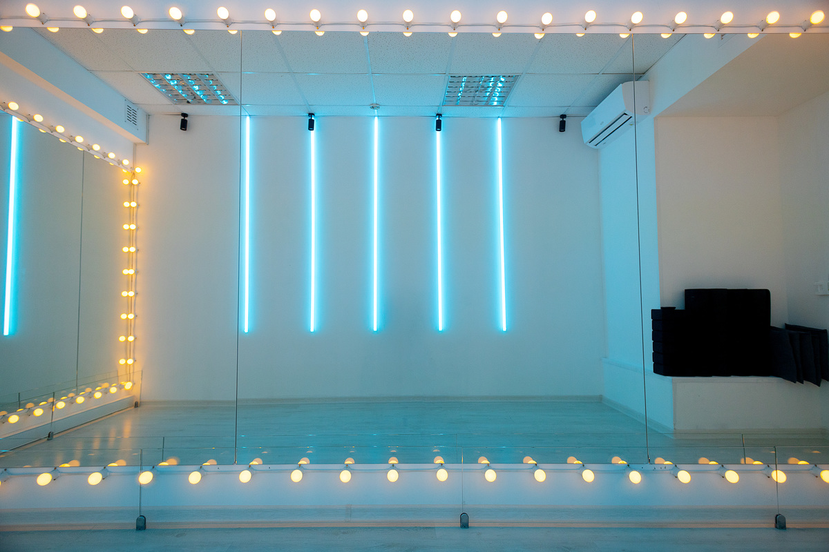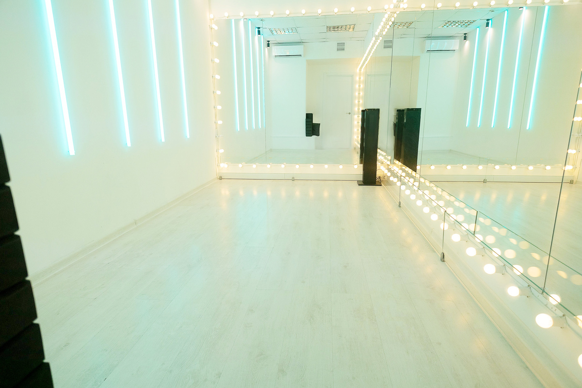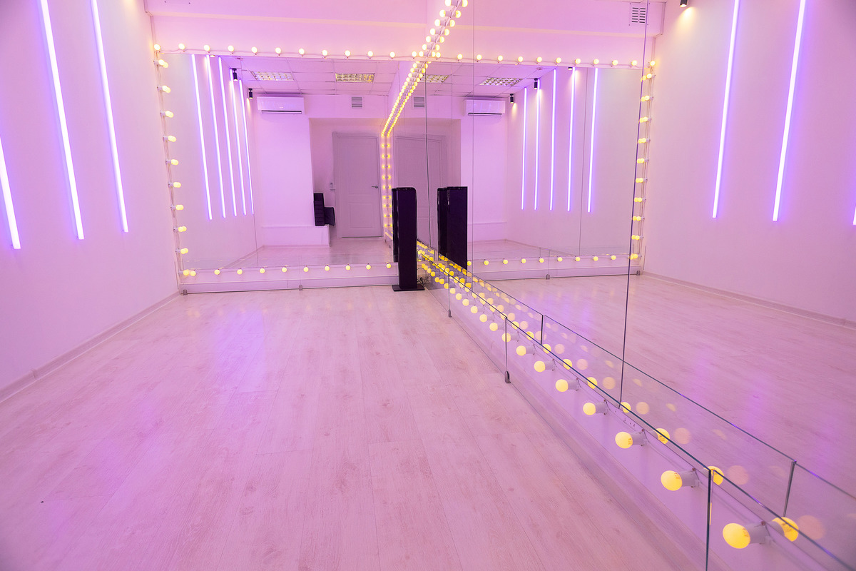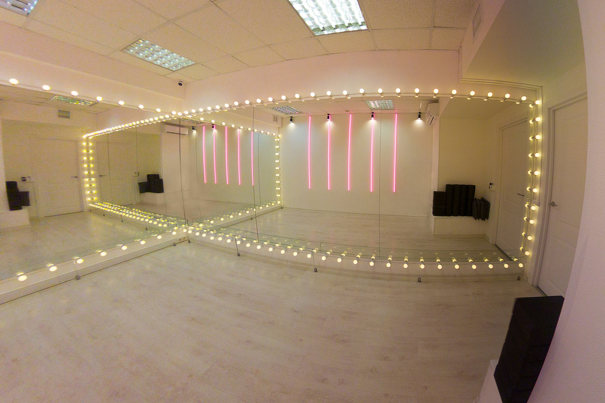 Прямоугольный зал с двумя зеркальными стенами, высота потолка 2.5м. Инструкция по подключению bluetooth на колонке. Всё освещение управляется клавишами расположенными при входе. Цвет светодиодных трубок меняется пультом. Кондиционер управляется пультом. Бонусы: 20% при бронировании в день занятия, 5-20% накопительный бонус постоянным клиентам. Комфортная вместимость 3 человека, 5 и более человек доплата +50р за 1 человека. Максимально 8 человек.