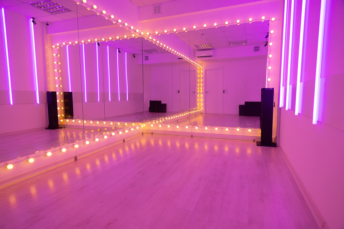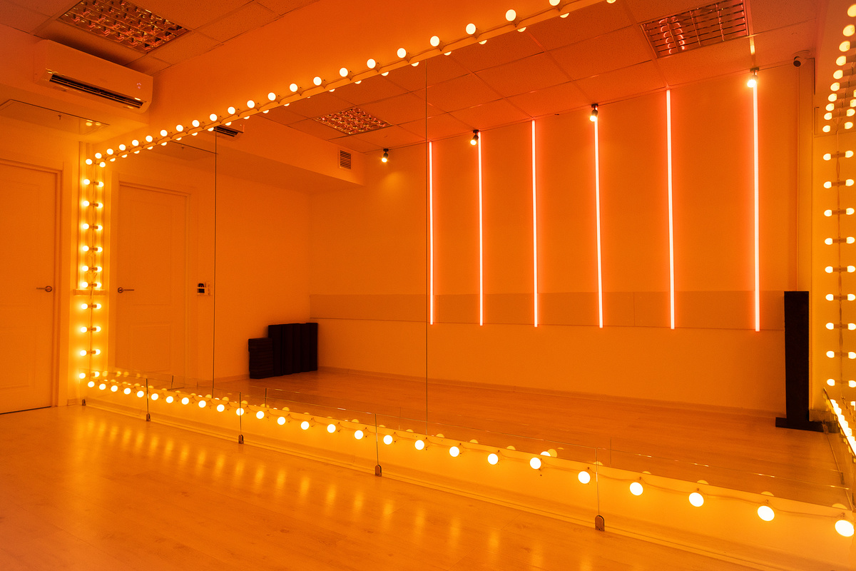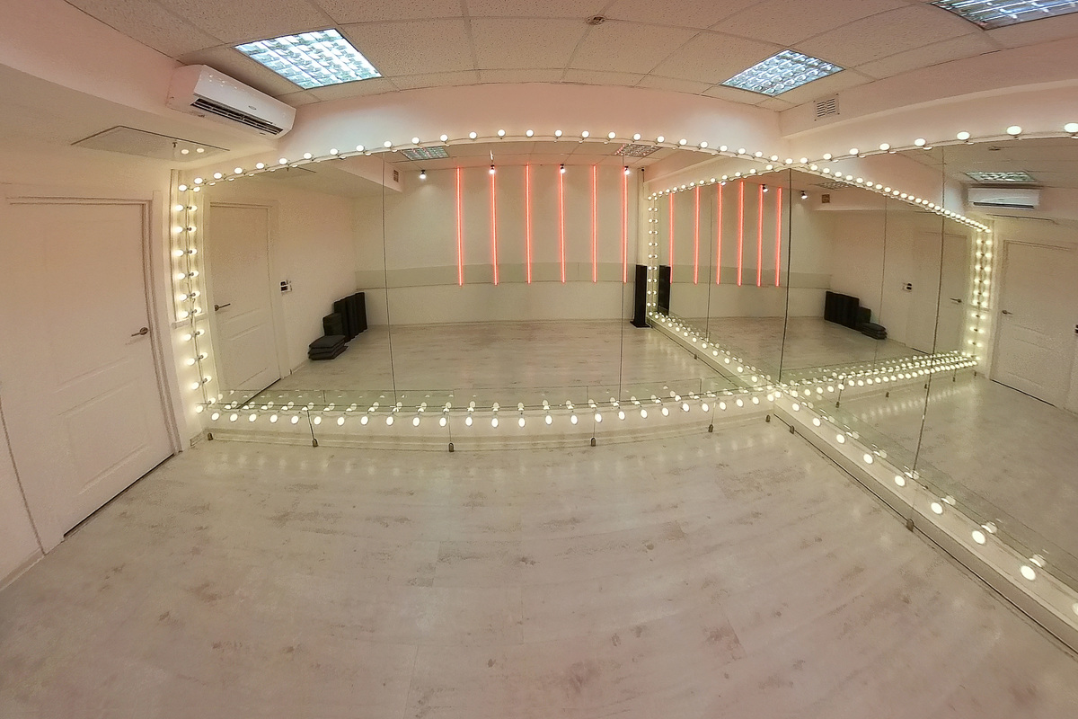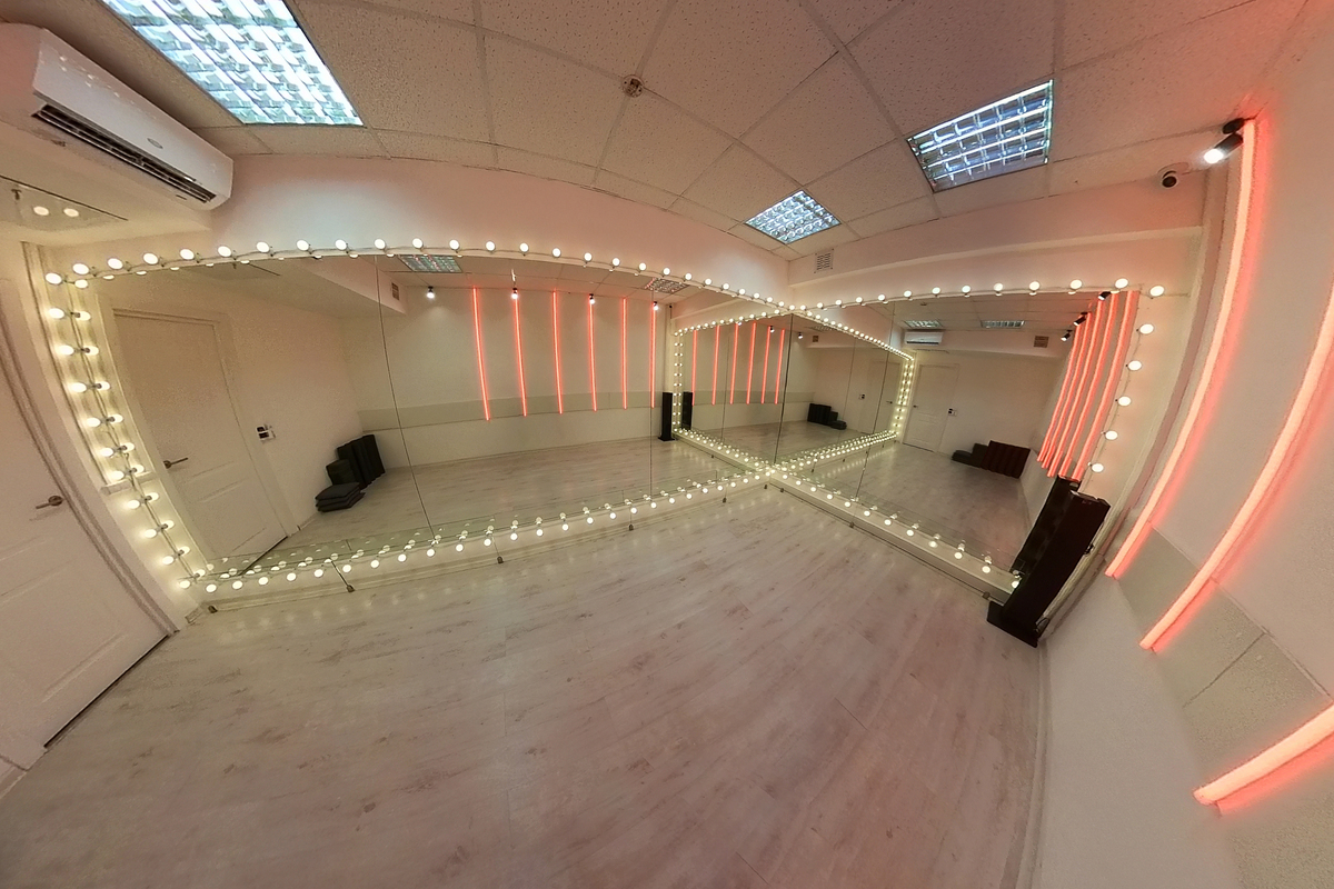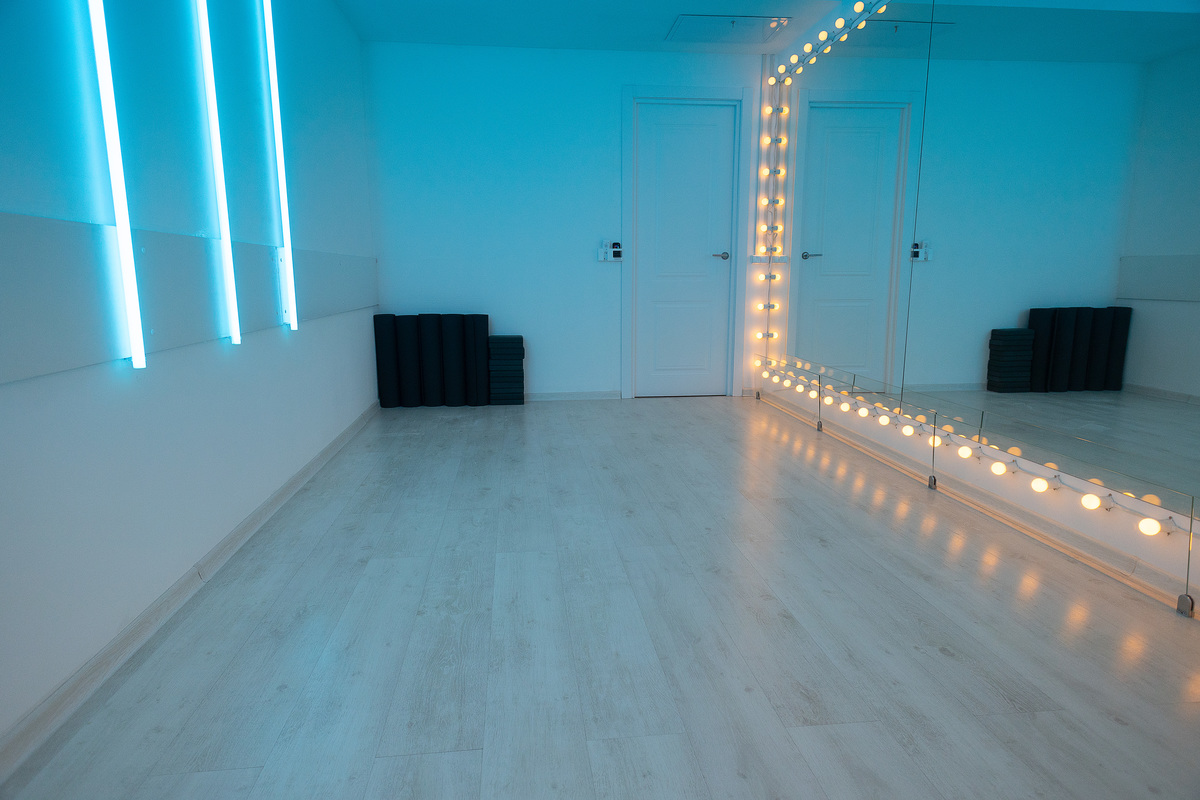 Прямоугольный зал с двумя зеркальными стенами, высота потолка 2.5м. Инструкция по подключению bluetooth на колонке. Всё освещение управляется клавишами расположенными при входе. Цвет светодиодных трубок меняется пультом. Кондиционер управляется пультом. Бонусы: 20% при бронировании в день занятия, 5-20% накопительный бонус постоянным клиентам. Комфортная вместимость 4 человека, 5 и более человек доплата +50р за 1 человека. Максимально 10 человек.