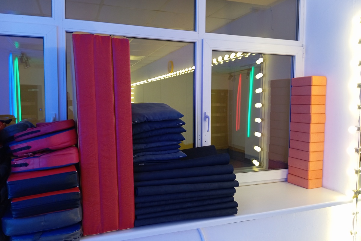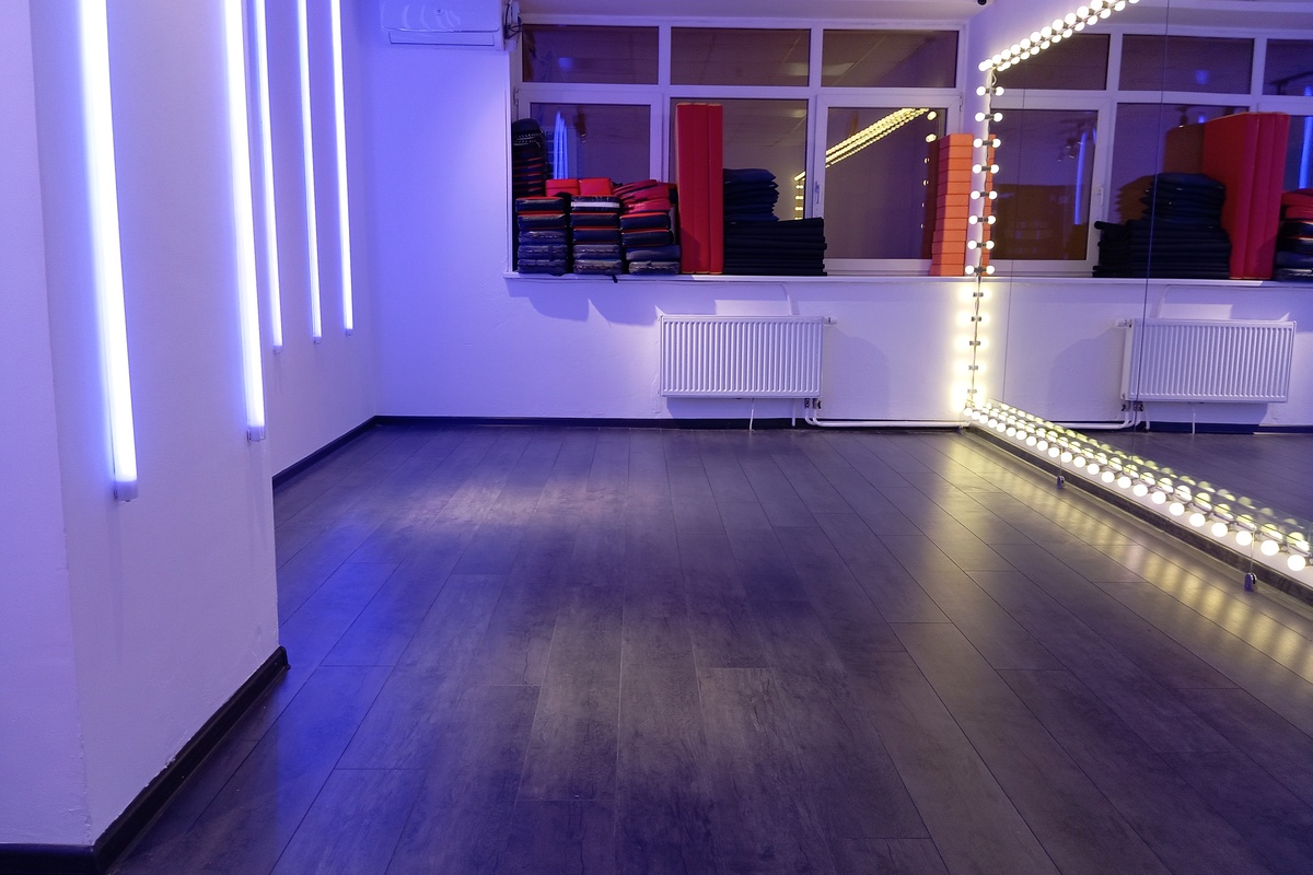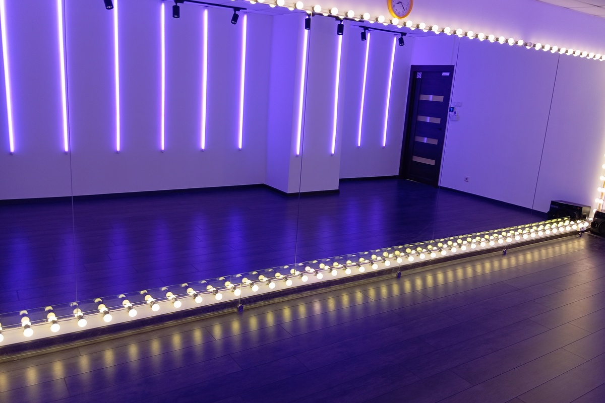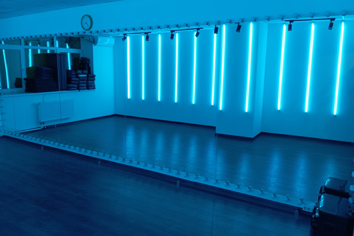 Прямоугольный зал с зеркальной стеной, высота потолка 3м. Инструкция по подключению bluetooth на колонке. Потолочное освещение и светодиодные трубки управляются клавишами расположенными при входе. Цвет светодиодных трубок меняется пультом. Подсветка зеркал управляется клавишей под зеркалом. Кондиционер управляется пультом. Скользящее покрытие пола. Комфортная вместимость 6 человек, 7 и более человек доплата +50р за 1 человека/час. Максимально 15 человек. Бонусы: 10% при бронировании в день занятия, 5-20% накопительный бонус постоянным клиентам.